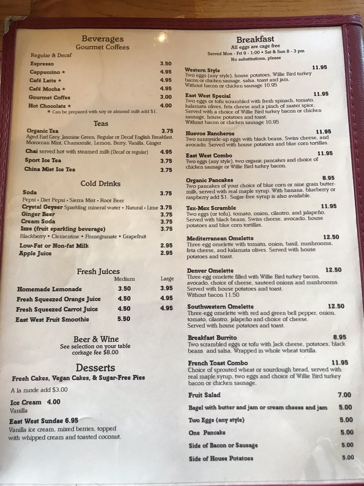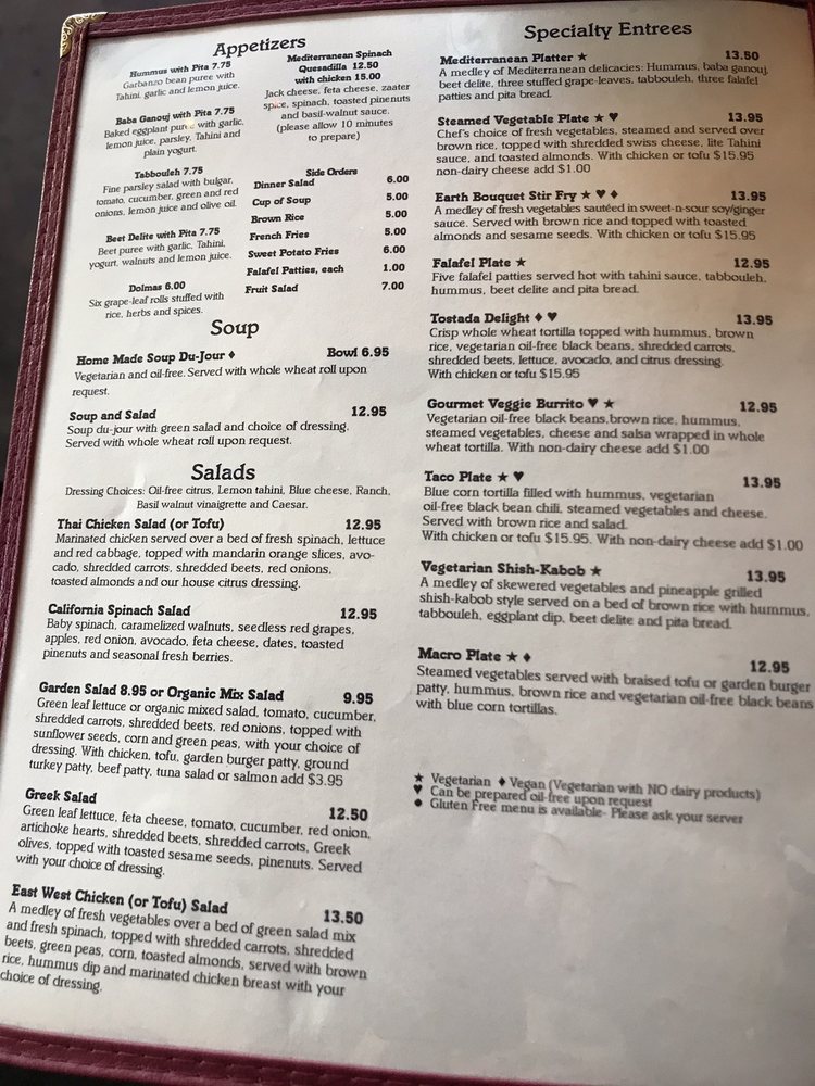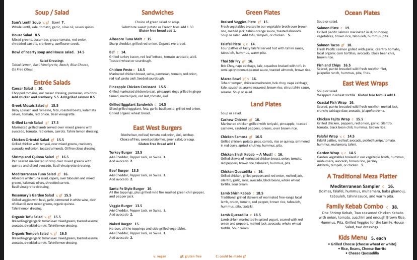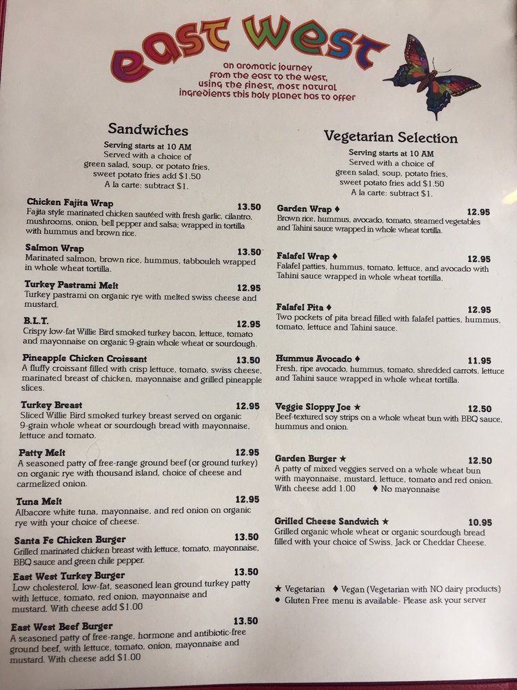East West Cafe & Restaurant, located at 557 Summerfield Rd in Santa Rosa, CA, offers a unique dining experience blending gluten-free, Mediterranean, and salad options. The menu includes vegan and oil-free choices, catering to a variety of dietary preferences. Customers praise the friendly service and the healthy, wholesome dishes. The restaurant has been a staple in the community for over 30 years, with a spacious and clean interior featuring a charming fireplace. Dishes like the garden veggie wrap and falafel wrap are fresh, generous in portion, and customizable. The California take on Mediterranean flavors impresses diners, with options for vegetarians, organic eaters, and gluten-free individuals. East West Cafe & Restaurant is a gem for those seeking flavorful, health-conscious meals in a relaxed setting.